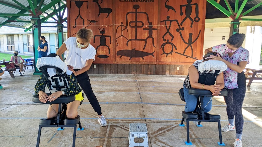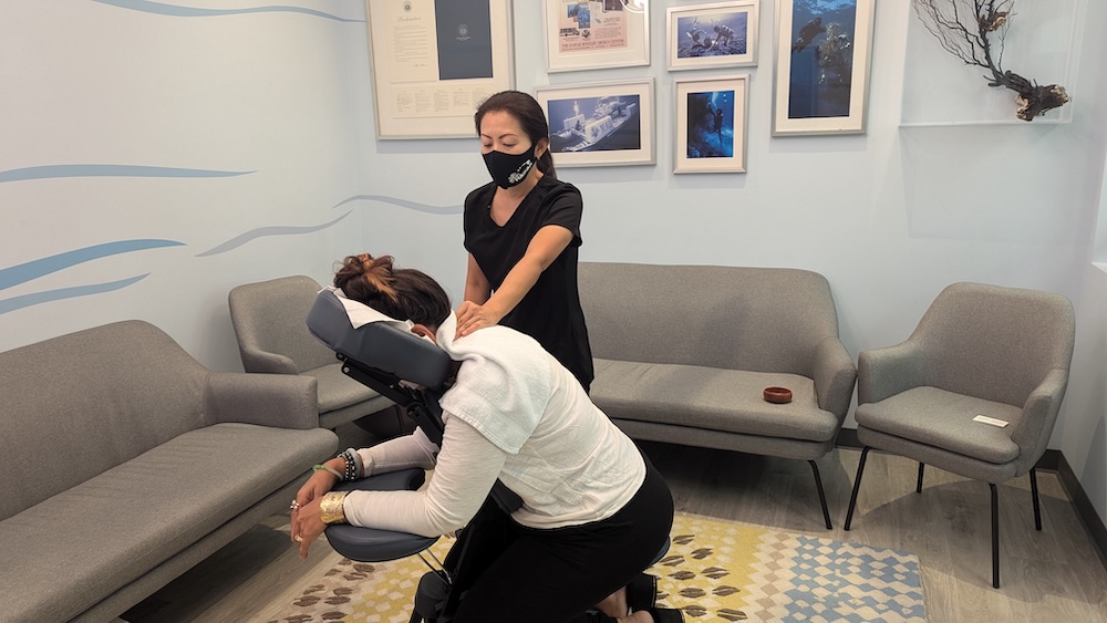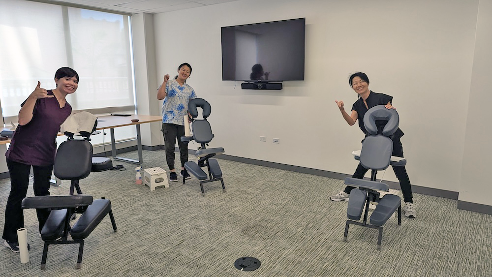 The number of therapists depends on the number of participants and the duration of your event. For example, if you have 100 employees and want each to receive a 12-minute chair massage over a 4-hour period, we recommend three therapists. Feel free to contact us for a customized recommendation based on your specific event needs.