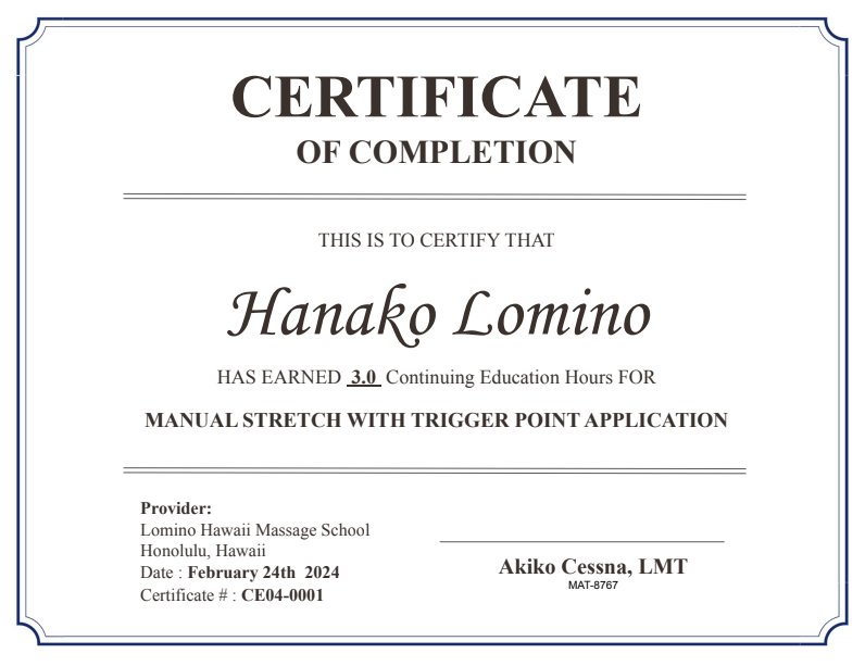 マッサージライセンスを更新するために10クレジットのCEを受講する必要があります。ハワイ州公認校主催のワークショップですのでCEのクレジットが付与されます。