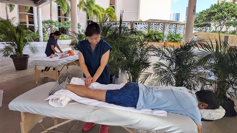 Three therapists are arranged for 4 hours to provide massages to hotel guests. This service has become a regular offering as an exclusive benefit for event participants each year.